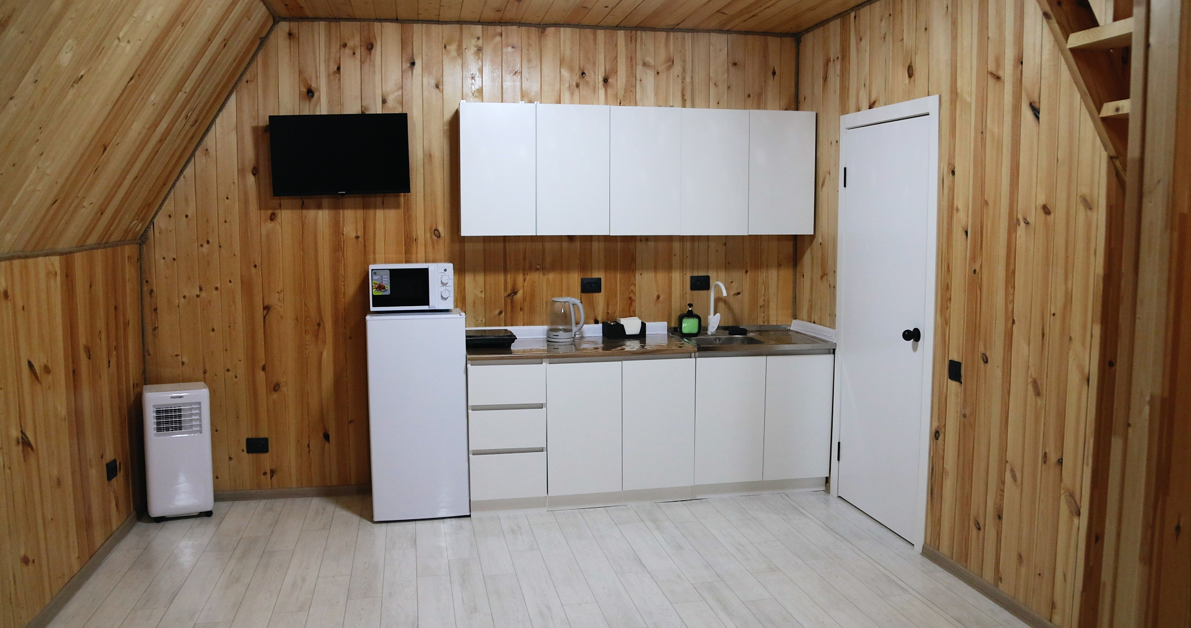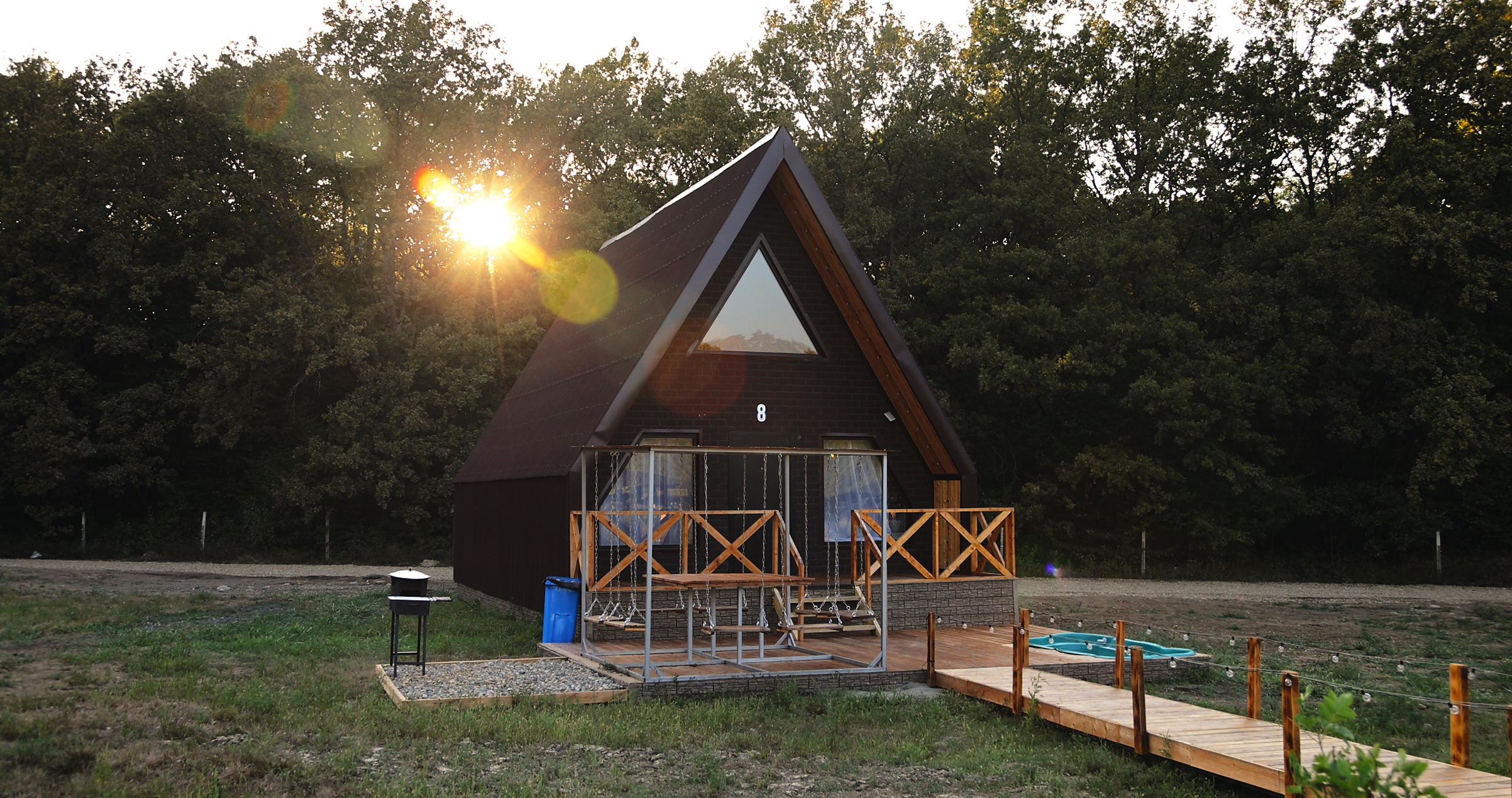 В каждом домике есть две двуспальная кровать, и раскладной комфортный диван, бесплатный Wi-Fi, терраса с большим столом, детский бассейн и зона для барбекю.