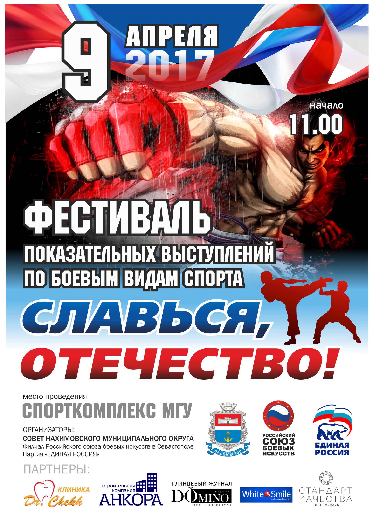 9 апреля в 11:00 в спорткомлексе МГУ состоится Фестиваль показательных выступлений по боевым видам спорта "Славься, Отечество", приуроченный к третьей годовщине возвращения Севастополя в состав Российской Федерации. Мероприятие соберет как новичков и любителей, так и настоящих профессионалов. Среди главных участников –дети и молодежь. Ведь главной задачей является привить здоровый образ жизни будущему поколению!
